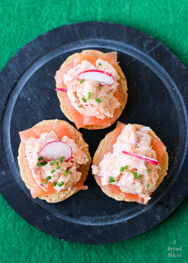2. Untamos nuestras tostas con la pasta y ponemos un poco de cebollino picado sobre ellas así como una lámina de rabanitos.